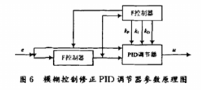 模糊PID控制器的原理是把輸入PID調(diào)節(jié)器的偏差e和偏差變化率ec同時輸入到模糊控制器中。圖中的F控制器實際上是由三個分模糊控制器組成的,分別對三個參數(shù)進行調(diào)節(jié),然后分別經(jīng)過模糊化、近似推理和清晰化后,把得出的修正量分別輸入PID調(diào)節(jié)器中,對三個系數(shù)進行實時在線修正,從而使被控對象具有良好的動態(tài)和靜態(tài)性能。