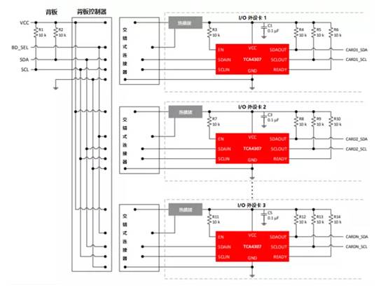 以TI的TCA4307為例——TCA4307 熱插拔 I2C 總線緩沖器支持將 I/O 卡插入帶電背板,而不會損壞數(shù)據(jù)和時鐘總線,適用于背板連接。TCA4307在 I/O 外設卡上,當發(fā)生熱插入事件時可將卡上的 I2C 設備安全地連接到背板。建立連接后,該器件將提供雙向緩沖,從而使背板和卡的電容保持分離。
