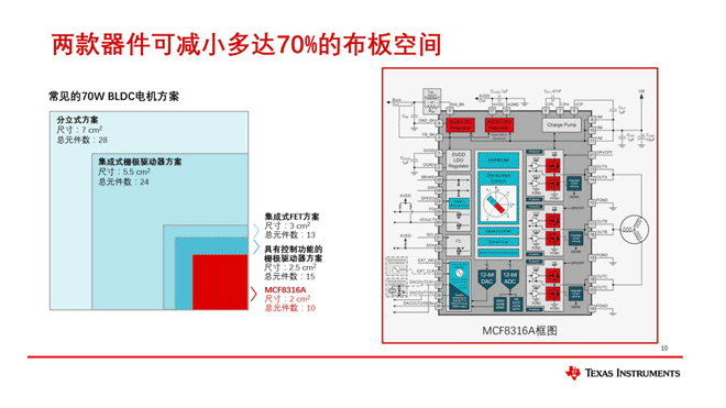 本次推出兩款新產(chǎn)品,分別是MCF8316A和MCT8316A。前者采用磁場定向控制技術(shù),后者梯形控制技術(shù),無需傳感器,通過這兩款產(chǎn)品,可以把整個電機(jī)方案的尺寸減少70%。