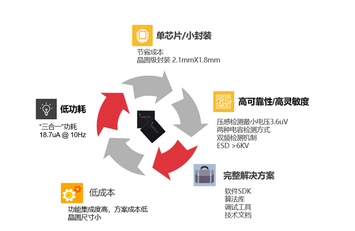 SRAM。其內(nèi)部集成了高精度ADC、1024倍增益放大的超低噪聲PGA,可實(shí)現(xiàn)高達(dá)21.5位的信號鏈有效精度,并配備了Offset自動消除硬件電路,可實(shí)現(xiàn)uV級小信號在各種環(huán)境干擾和溫度漂移下的精準(zhǔn)測量。泰矽微還開發(fā)了獨(dú)創(chuàng)的降低系統(tǒng)整體功耗的Tinywork®技術(shù)(專利號:CN111427443A),使得外設(shè)在睡眠模式下,無需內(nèi)核處理器的干預(yù)也能獨(dú)立工作和相互協(xié)同,可將典型應(yīng)用場景的工作電流降低80%以上。外加超低功耗的睡眠模式設(shè)計(jì),在TWS耳機(jī)人機(jī)交互應(yīng)用場景中,將壓力檢測,滑條及入耳檢測三種功能融合下的典型應(yīng)用功耗控制在18uA左右,引領(lǐng)行業(yè)標(biāo)桿水準(zhǔn)。TCAE系列MCU具有高可靠性的典型特征,高達(dá)6kV的ESD設(shè)計(jì)免除了外部器件防護(hù)的需求,有利于非常局限的狹小空間中的硬件設(shè)計(jì)。