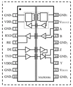 NSiP83086 是一款高可靠性隔離式半/全雙工RS-485收發(fā)器(用作半雙工時(shí),只需將B和Z,A和Y管腳相連),集成的隔離式DC/DC轉(zhuǎn)換器使用片上變壓器可提供高達(dá)500mW 的功率輸出功率,反饋PWM 信號(hào)由基于Novosense電容隔離技術(shù)的數(shù)字隔離器發(fā)送到初級(jí)側(cè)。支持 5kVrms絕緣耐壓,而高集成度解決方案有助于簡(jiǎn)化系統(tǒng)設(shè)計(jì)和提高可靠性。