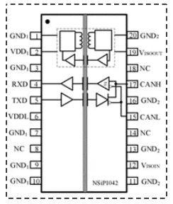 NSiP1042 是一款高可靠性隔離式CAN收發(fā)器,集成隔離DC/DC轉(zhuǎn)換器。隔離式DC/DC轉(zhuǎn)換器使用片上變壓器提供高達(dá) 500mW 的輸出功率,反饋 PWM 信號(hào)由基于 Novosense 電容隔離技術(shù)的數(shù)字隔離器發(fā)送到初級(jí)側(cè)。支持 5kVrms 絕緣耐壓,而高度集成的解決方案有助于簡(jiǎn)化系統(tǒng)設(shè)計(jì)并提高系統(tǒng)可靠性。
