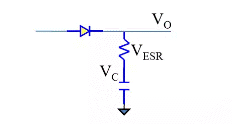 電容穩(wěn)壓的原理就是當(dāng)VO電壓上升時,吸入電流,將能量存儲于電容,當(dāng)VO電壓下降時,吐出電流,釋放能量。這個過程中,電流始終流過ESR。