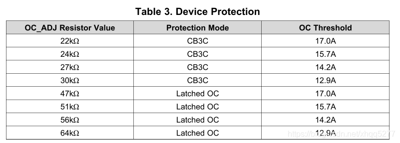 2. 確定系統(tǒng)功率,設(shè)計(jì)限流閾值: 通過OC_ADJ引腳串聯(lián)電阻設(shè)定: