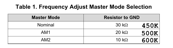 3. 設(shè)計(jì)classD 采頻率: 通過FREQ_ADJ引腳串聯(lián)電阻設(shè)定: