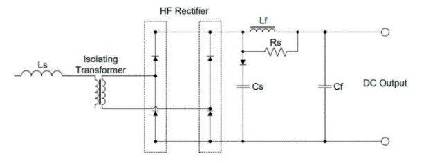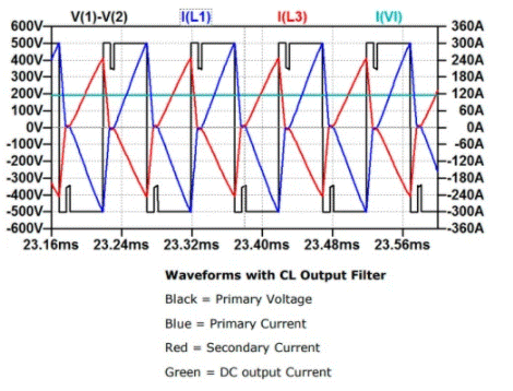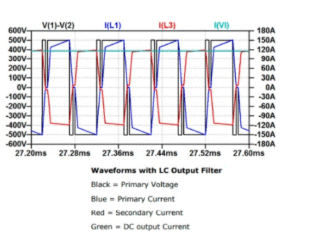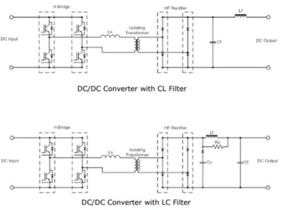 這是本質(zhì)上是隔離的單向轉(zhuǎn)換器。它的初級繞組借助于單相H橋逆變器來驅(qū)動。直流輸出是通過全橋整流器產(chǎn)生的,并且為了直流輸出的清潔度需要一個輸出濾波器,可以是CL或LC。帶有LC和CL濾波器的DC-DC轉(zhuǎn)換器如圖1所示。在CL濾波器的情況下,不需要整流二極管來整流二極管。由于整流器電流不連續(xù),H橋中的電流波形為三角形。較高的電流峰值導(dǎo)致三角波形效率低下。如圖2所示,在400直流輸出和500直流輸入下有120A電流充電。使用LC輸出濾波器會產(chǎn)生連續(xù)電流,該連續(xù)電流會在H橋中產(chǎn)生具有低電流峰值的方波。與使用LC濾波器有關(guān)的另一個優(yōu)勢是效率高[1]。LC濾波器的波形如圖3所示。