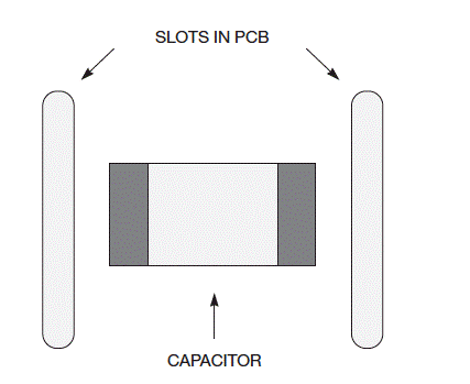 添加第二個(gè)電容器會增加成本,但不及將噪聲電容器替換為可能不會產(chǎn)生噪聲的電容器要多。Digi-Key的陶瓷電容器售價(jià)約為27美分(1000)。Kemet的KPS系列靜音部件的價(jià)格約為1.50美元。第二種方法涉及在PCB的電容器兩端附近制作一個(gè)插槽(圖2)。當(dāng)電容器膨脹和收縮時(shí),它僅使PCB的一小部分彎曲,這將減少噪聲。