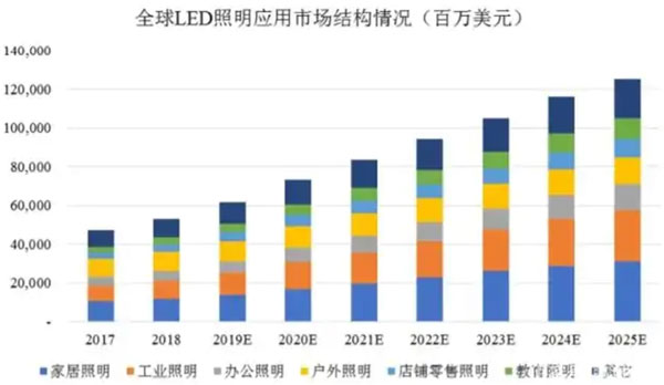 從應(yīng)用場景看,家居照明、工業(yè)照明、戶外照明、辦公照明、店鋪零售照明、教育照明等是LED照明的主要應(yīng)用場景。