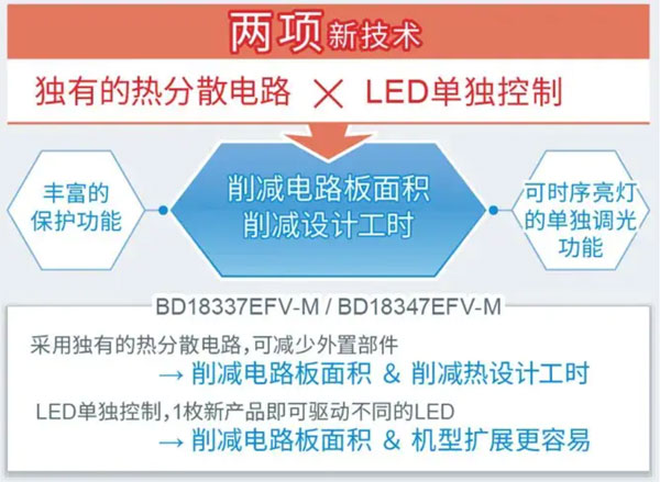 圖5:BD18337EFV-M獨有的兩項新技術(shù)有助于大幅削減車載LED燈的占板面積和設(shè)計周期(圖源:ROHM)