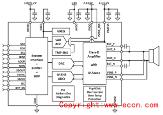 TI公司的TAS2764是具有揚(yáng)聲器IV檢測的數(shù)字輸入單聲道D類音頻放大器,能有效在小性揚(yáng)聲器驅(qū)動大峰值功率.D類放大器能在4 Ω負(fù)載提供13W連續(xù)功率,在電源12V時THD+N小于1%.器件采用Y橋架構(gòu)改善了低功率輸出和空閑模式時的整體效率.集成的揚(yáng)聲器電壓和電流檢測提供了揚(yáng)聲器行為的實(shí)時監(jiān)測.電源跟蹤峰值電壓限制器優(yōu)化了放大器預(yù)留空間.有多個閾值的電壓不足保護(hù)方案允許在電壓下降時降低信號通路的增益.TAS2764的超聲波支持所用的器件用于先進(jìn)的超聲波應(yīng)用如運(yùn)動和接近檢測,手勢識別等.多達(dá)8個TAS2764通過I2S/TDM和I2C接口共享共同總線.1W時的效率為81%,3W時的效率為85%,噪聲門模式的電流為3mA,硬件關(guān)斷模式的電流<1uA.器件采用30點(diǎn)0.4mm間隔CSP封裝.主要用在便攜式計算機(jī),平板電腦,無線揚(yáng)聲器和消費(fèi)類音頻設(shè)備.本文介紹了TAS2764主要特性, 功能框圖和電路圖,應(yīng)用電路圖和評估模塊TAS2764EVM主要特性,電路圖,材料清單和PCB設(shè)計圖.