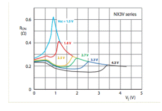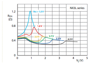NX3L和NX3V器件的低導(dǎo)通電阻和低Ron平坦度的結(jié)合(請參見下面的曲線)極大地降低了開關(guān)信號的衰減和失真,從而消除了許多應(yīng)用中對緩沖放大器的需求。