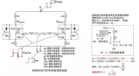 在并聯(lián)功率MOSFET時(shí)未插入柵極電阻而直接連接時(shí)發(fā)生的柵極寄生振蕩。高頻率反復(fù)接通、斷開漏極—源極電壓時(shí),在由柵極—漏極電容Cgd(Crss)和柵極引腳電感Lg形成的諧振電路上發(fā)生此寄生振蕩。當(dāng)諧振條件(ωL=1/ωC)成立時(shí),在柵極—源極間外加遠(yuǎn)遠(yuǎn)大于驅(qū)動(dòng)電壓Vgs(Vin)的振動(dòng)電壓,由于超出柵極—源極間額定電壓導(dǎo)致柵極破壞,或者接通、斷開漏極—源極間電壓時(shí)的振動(dòng)電壓通過(guò)柵極—漏極電容Cgd和Vgs波形重疊導(dǎo)致正向反饋,因此可能會(huì)由于誤動(dòng)作引起振蕩破壞。