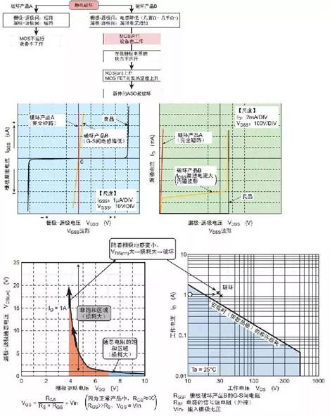 主要是在柵極和源極之間存在電壓浪涌和靜電而引起的破壞,即柵極過(guò)電壓破壞和由上電狀態(tài)中靜電在GS兩端(包括安裝和和測(cè)定設(shè)備的帶電)而導(dǎo)致的柵極破壞。
