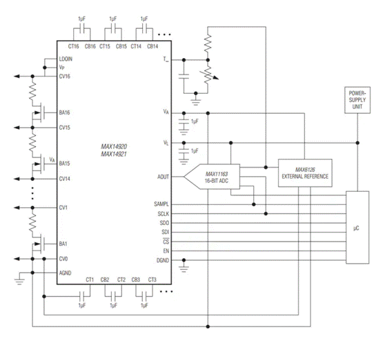 Integrated的MAX14920和與之類似的MAX14921兩款電池測(cè)量模擬前端(AFE)集成電路可以對(duì)電池組中的電池電壓進(jìn)行準(zhǔn)確采樣,最高支持+65V電壓;MAX14920最多支持12個(gè)電池,而MAX14921最多支持16個(gè)電池,除此以外兩者完全一致(圖2)。該器件同時(shí)對(duì)所有電池電壓采樣,以準(zhǔn)確確定充電狀態(tài)和源電阻,這對(duì)于大型電池組而言是一項(xiàng)節(jié)省時(shí)間的功能。所有電池電壓均在單位增益上進(jìn)行電平移位,使之以接地電壓作為參考,極大地簡(jiǎn)化了外部模數(shù)轉(zhuǎn)換器(ADC)的數(shù)據(jù)轉(zhuǎn)換修正工作。