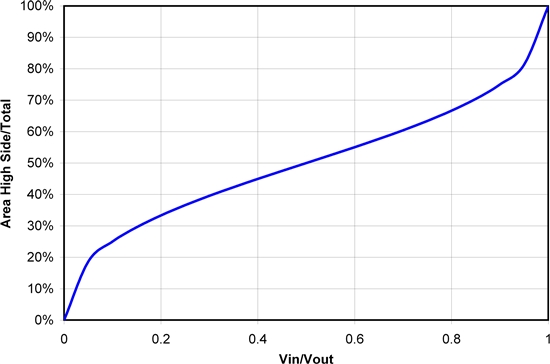 通過圖 1,我們知道 50% 轉(zhuǎn)換比率時(shí)出現(xiàn)最佳傳導(dǎo)損耗極值。但是,在其他轉(zhuǎn)換比率條件下,可以將損耗降至這一水平以下。附錄 1 給出了進(jìn)行這種優(yōu)化的數(shù)學(xué)計(jì)算方法,而圖 2 顯示了其計(jì)算結(jié)果。即使在極低的轉(zhuǎn)換比率條件下,F(xiàn)ET 芯片面積的很大一部分都應(yīng)該用于高側(cè) FET。高轉(zhuǎn)換比率時(shí)同樣如此;應(yīng)該有很大一部分面積用于低側(cè)。這些結(jié)果是對(duì)這一問題的初步研究,其并未包括如高側(cè)和低側(cè)FET之間的各種具體電阻值,開關(guān)速度的影響,或者對(duì)這種芯片面積進(jìn)行封裝相關(guān)的成本和電阻等諸多方面。但是,它為確定 FET 之間的電阻比提供了一個(gè)良好的開端,并且應(yīng)會(huì)在FET選擇方面實(shí)現(xiàn)更好的整體折中。