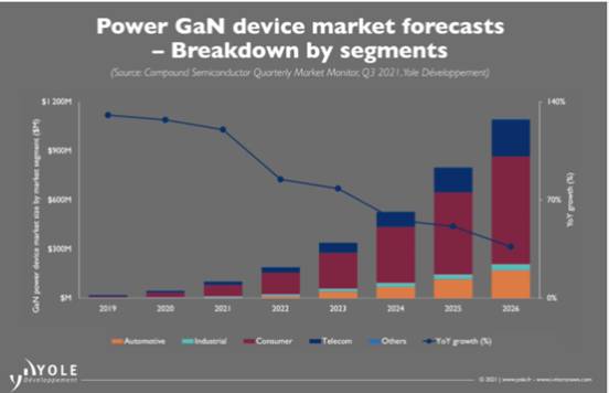 預(yù)計 2021 年 GaN 功率器件收入將達到 1 億美元左右。但隨著 GaN 器件供應(yīng)商尋求進入其他市場以提高產(chǎn)量,預(yù)計到 2026 年這一數(shù)字將激增至 10 億美元,其中EV/HEV市場將是重點。