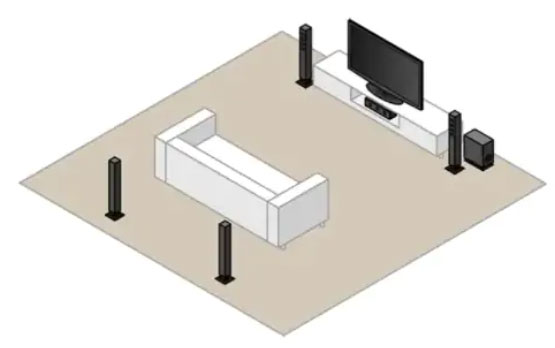 圖1:5.1環(huán)繞聲使用五個放置在特定位置的全頻揚聲器和一個重低音揚聲器。音頻處理工程師可以通過混音,讓聽眾感覺到聲音似乎在他們周圍移動。重低音揚聲器通常可以放在任意位置。(圖源:Zern Liew/Shutterstock.com)