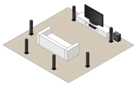 圖2:6.1環(huán)繞聲在左右兩側(cè)配備了揚聲器,當音頻對象從前面移向側(cè)面或背后時可增強移動音效。重低音揚聲器依然可以隨意放置,這里也不討論有關低音的話題。(圖源:Zern Liew/Shutterstock.com)