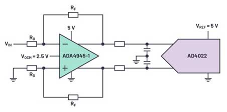 ADA4945-1雙極性差分放大器妥善地權(quán)衡了上述這些特性。它具有低直流失調(diào)、失調(diào)溫漂和出色的動態(tài)性能,非常適合多種高分辨率、功能強大的數(shù)據(jù)采集和信號處理應(yīng)用,這些應(yīng)用通常需要使用驅(qū)動器來驅(qū)動ADC,如圖1所示,由ADA4945-1驅(qū)動AD4022 ADC。 ADA4945-1可配置多種功率模式,您可以在特定轉(zhuǎn)換器上更好地權(quán)衡性能與功率。例如,在全功率模式下,可與AD4020配對,降低至低功耗模式后,可以適應(yīng)AD4021或AD4022的低采樣速率。