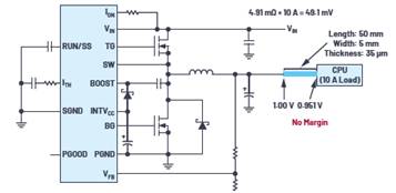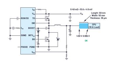 在這些數(shù)字系統(tǒng)中,有很多都使用高電流和低電壓,因此更需要盡可能縮短電源和負(fù)載之間的距離。高電流導(dǎo)致的一個明顯問題是,從轉(zhuǎn)換器到負(fù)載,線路產(chǎn)生的電壓會不斷下降。圖1和圖2顯示了電源和負(fù)載之間引線電阻的最小化如何使轉(zhuǎn)換器的輸出電壓降最小化——本例中是控制器IC和為CPU供電的MOSFET。