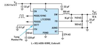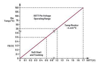 在上述解決方案中,LTC3310S內(nèi)部溫度升幅通過高效率操作而得以最小化,即使在CPU、SoC和FPGA等高功耗器件周圍的惡劣溫度條件下,它也能夠可靠地運(yùn)行。此外,LTC3310S內(nèi)置精密溫度傳感器,支持通過SSTT引腳測量內(nèi)部結(jié)溫,如圖10所示,相應(yīng)的溫度傳感器特性如圖11所示。