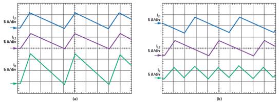 圖13.比較兩個版本的雙通道轉(zhuǎn)換器的電感電流和輸出電流:(a) 同相通道與 (b) 反相通道