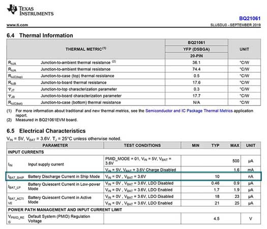 部分IC具有多種關(guān)斷狀態(tài),比如 TI的BQ25120電池充電器的2nA運輸模式,或者 TPS61094 升壓轉(zhuǎn)換器的4nA旁路模式。在這些高級關(guān)斷狀態(tài)下,為了僅消耗極少量的靜態(tài)電流,通常會啟用非常有限的器件功能。與靜態(tài)電流為700nA的 BQ25120 高阻抗(關(guān)斷)模式和靜態(tài)電流為200nA 的TPS61094 關(guān)斷模式相比,運輸節(jié)電模式和旁路模式可將電池運行時間分別延長 350 倍和 50 倍。