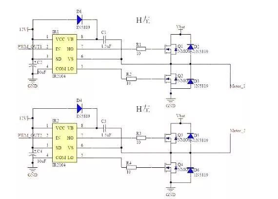 實踐驅(qū)動電路中通常要用硬件電路便當?shù)乜刂崎_關(guān),電機驅(qū)動板主要采用兩種驅(qū)動芯片,一種是全橋驅(qū)動HIP4082,一種是半橋驅(qū)動IR2104,半橋電路是兩個MOS管組成的振蕩,全橋電路是四個MOS管組成的振蕩。其中,IR2104型半橋驅(qū)動芯片能夠驅(qū)動高端和低端兩個N溝道MOSFET,能提供較大的柵極驅(qū)動電流,并具有硬件死區(qū)、硬件防同臂導通等功用。運用兩片IR2104型半橋驅(qū)動芯片能夠組成完好的直流電機H橋式驅(qū)動電路,而且IR2104價錢低廉,功用完善,輸出功率相對HIP4082較低,此計劃采用較多。