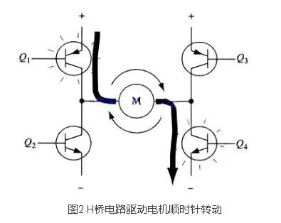 要使電機運轉(zhuǎn),必需使對角線上的一對三極管導通。例如,如圖2所示,當Q1管和Q4管導通時,電流就從電源正極經(jīng)Q1從左至右穿過電機,然后再經(jīng)Q4回到電源負極。按圖中電流箭頭所示,該流向的電流將驅(qū)動電機順時針轉(zhuǎn)動。當三極管Q1和Q4導通時,電流將從左至右流過電機,從而驅(qū)動電機按特定方向轉(zhuǎn)動(電機四周的箭頭指示為順時針方向)。