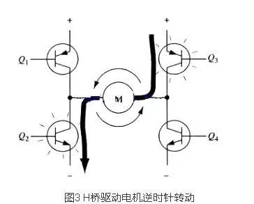 圖3所示為另一對三極管Q2和Q3導通的狀況,電流將從右至左流過電機。當三極管Q2和Q3導通時,電流將從右至左流過電機,從而驅(qū)動電機沿另一方向轉(zhuǎn)動(電機四周的箭頭表示為逆時針方向)。