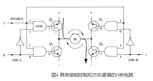 采用以上辦法,電機的運轉(zhuǎn)就只需求用三個信號控制:兩個方向信號和一個使能信號。假如DIR-L信號為0,DIR-R信號為1,并且使能信號是1,那么三極管Q1和Q4導通,電流從左至右流經(jīng)電機(如圖5所示);假如DIR-L信號變?yōu)?,而DIR-R信號變?yōu)?,那么Q2和Q3將導通,電流則反向流過電機。