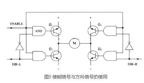 改良電路在根本H橋電路的根底上增加了4個與門和2個非門。4個與門同一個“使能”導通訊號相接,這樣,用這一個信號就能控制整個電路的開關(guān)。而2個非門經(jīng)過提供一種方向輸人,能夠保證任何時分在H橋的同側(cè)腿上都只要一個三極管能導通。(與本節(jié)前面的表示圖一樣,圖4所示也不是一個完好的電路圖,特別是圖中與門和三極管直接銜接是不能正常工作的)