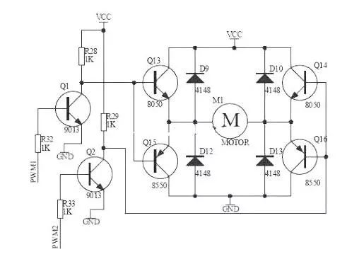 驅(qū)動電機時,保證H橋上兩個同側(cè)的三極管不會同時導通十分重要。假如三極管Q1和Q2同時導通,那么電流就會從正極穿過兩個三極管直接回到負極。此時,電路中除了三極管外沒有其他任何負載,因而電路上的電流就可能到達ZD值(該電流僅受電源性能限制),以至燒壞三極管。基于上述緣由,在實踐驅(qū)動電路中通常要用硬件電路便當?shù)乜刂迫龢O管的開關(guān)。