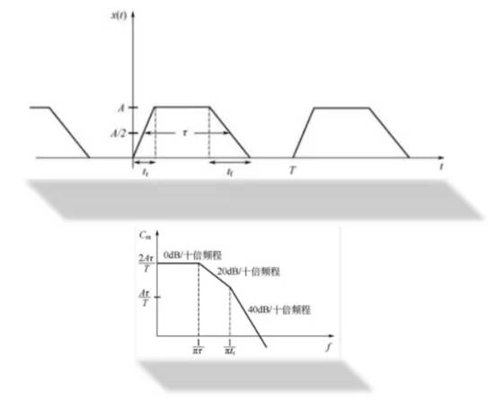 下圖為梯形脈沖波形的時(shí)域波形和頻譜包絡(luò)線;A=幅度,tr=上升沿時(shí)間,τ=平均寬度。從圖中可以看出上升時(shí)間對(duì)于高頻諧波存在的影響?梢(jiàn)在EMC設(shè)計(jì)中,著重關(guān)注快速上升沿信號(hào)是有充分的理由的,而且?guī)缀跛嘘P(guān)于干擾發(fā)射的測(cè)試中,快速上升沿信號(hào),都是最主要因素。那是否只需要處理這類(lèi)信號(hào)就行了呢。由于EMC測(cè)試中還有抗擾度項(xiàng)目,所以對(duì)慢速信號(hào)的處理也需要處理。