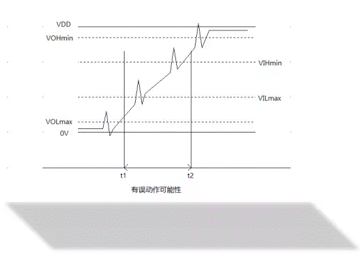 因?yàn)閿?shù)字信號(hào)緩慢上升或下降時(shí),。如下圖所示,由于t1-t2的上升時(shí)間變緩,就降低了噪聲容限,出現(xiàn)誤動(dòng)作的可能性大大增加。信號(hào)在變化的中段,特別時(shí)閾值附近(VILmax-VIHmin附近)的噪聲容限最低,因此在信號(hào)上疊加的噪聲即使很小也會(huì)造成誤動(dòng)作。