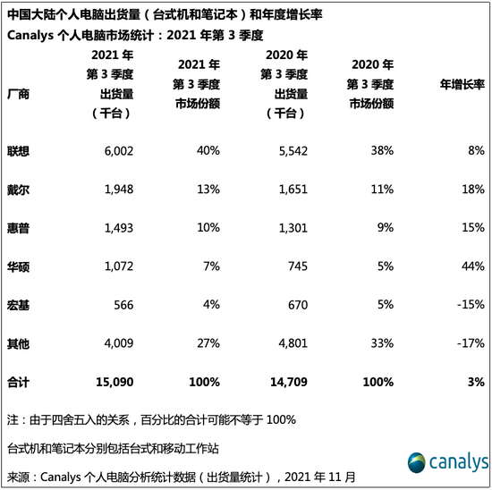 2021年第3季度,中國大陸個人電腦總出貨量(臺式機(jī)和筆記本)同比增長3%,環(huán)比增長10%,總出貨量達(dá)到1500萬臺。與去年相比,臺式機(jī)(包括臺式工作站)的出貨量增長3.8%,達(dá)到530萬臺。筆記本(包括移動工作站)的出貨量小幅增長1.9%,達(dá)到970萬臺?偝鲐浟砍^了2020年第3季度的1470萬臺紀(jì)錄,創(chuàng)下第3季度歷史新高。