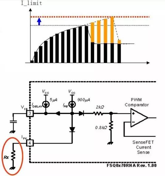 1)增大峰值電流限流點(diǎn)I_limit,可允許流過(guò)更大電感電流Id:將與Pin4相接的電阻增大,從內(nèi)部電流源Ifb分流更小,使作為電流限制參考電壓的PWM比較器正輸入端的電壓將上升,即允許更大的電流通過(guò)MOSFET/變壓器,可以提供更大的能量。