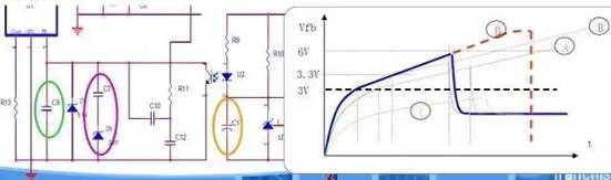 B.由于A方法有不足,將一個(gè)電容(C7)串連穩(wěn)壓管(D6,3.3V)并聯(lián)到反饋腳。此法不會(huì)影響正常工作,如B線(xiàn)所示,當(dāng)Vfb<3.3V時(shí),穩(wěn)壓管不會(huì)導(dǎo)通,分流。上升3.3V時(shí),穩(wěn)壓管進(jìn)入穩(wěn)壓狀態(tài),電容C7開(kāi)始充電分流,減小后續(xù)Vfb的上升斜率。C。在431的K-A端并聯(lián)一個(gè)電容(C11),電源啟動(dòng)時(shí),C11電壓較低,并由光耦二極管和431的偏置電阻R10進(jìn)行充電。這樣光耦就有較大電流通過(guò),使光耦光敏管阻抗較低而分流,Vfb將緩慢上升,如C線(xiàn)所示。R10×C11影響充電時(shí)間,也就影響輸出的上升時(shí)間。