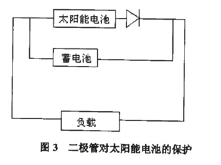 前面所說的太陽能電池不能直接對負(fù)載供電,必須把電能存儲(chǔ)在蓄電池中,蓄電池對負(fù)載供電,但是蓄電池的電壓不能加在太陽能電池上,必須保證太陽能電池和蓄電池之間的充電是單向的。很簡單的方法是在太陽能電池和蓄電池之間加一個(gè)二極管,如圖3所示。