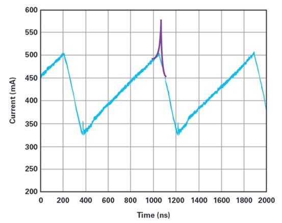 圖3顯示了通過與所用示波器兼容的電流探頭檢測到的開關(guān)電源的電感電流(藍(lán)色)的測量結(jié)果。除了顯示為藍(lán)色的測量結(jié)果之外,還添加了紫色標(biāo)記,它指示當(dāng)電感開始接近峰值電流進(jìn)入過度飽和時,流過電感的電流狀況。當(dāng)選擇的電感對于給定的應(yīng)用不能提供足夠的額定電流時,就會發(fā)生這種情況。在開關(guān)電源中進(jìn)行電感電流測量的主要原因之一是,它可以幫助識別是否正確選擇了電感,或者在工作中或故障情況下是否會出現(xiàn)電感飽和。