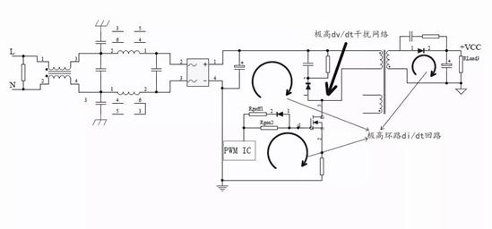 由1-1和1-2式可知,寄生電感和di/dt形成電壓尖峰,寄生電容和dv/dt形成電流尖峰。這些快速變化的電流和關(guān)聯(lián)的諧波在其他地方產(chǎn)生耦合的噪聲電壓,因此影響到開關(guān)電源EMI特性。下面以反激式開關(guān)拓?fù)錇槔,對降低MOSFET的dv/dt和di/dt措施進(jìn)行介紹。