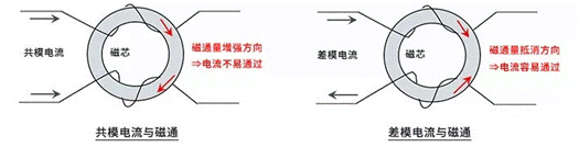 如圖所示,差模電流是在2根導線上往復流動,因此磁芯產(chǎn)生的磁通方向相反,磁通抵消,因此不能起到扼流作用,而是直接通過。