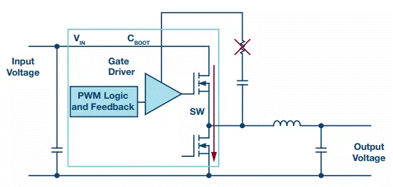 圖1:對開關(guān)模式電源進(jìn)行開關(guān)轉(zhuǎn)換,在開關(guān)節(jié)點(diǎn)處施加輸入電壓