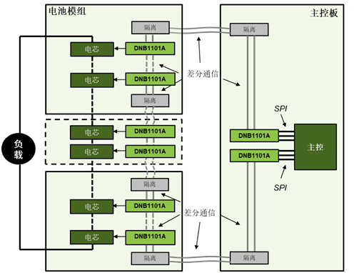 DNB1101A為每個單獨的電芯或并聯(lián)的一組電芯提供多種傳感功能,包括電壓監(jiān)測、溫度監(jiān)測和電化學阻抗譜(EIS)監(jiān)測。通過差分菊花鏈,電池參數(shù)信息被傳輸?shù)诫姵亟M控制器。鏈中的第一顆芯片將標準SPI信號轉換為菊花鏈差分信號,反之亦然。芯片支持環(huán)形通信架構。