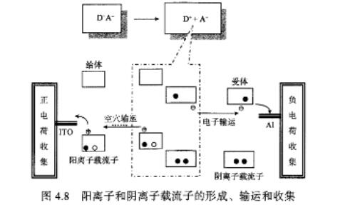 圖4.7和圖4.8為給體/受體組成的有機太陽能電池工作機理示意圖?梢钥闯觯骷a(chǎn)生光伏效應(yīng)的過程如下(圖4o:①當(dāng)能量大于HOMOˉLUMO能隙的光子照射時,給體分子將由基態(tài)躍遷至激發(fā)態(tài),形成激子;②中性給體激子經(jīng)過擴散后到達(dá)給體與受體界面;③界面附近的給體激子通過界面內(nèi)建電場的輔助,克服激子中電子空穴對之間的庫侖束縛力后,進(jìn)行電荷轉(zhuǎn)移――電子由給體LUMO能級轉(zhuǎn)移到受體LUMo能級,形成電荷轉(zhuǎn)移復(fù)合物;④電荷轉(zhuǎn)移復(fù)合物中的電子空穴對需要再次克服庫侖束縛力后,才能解離為定域化的自由電荷,即陽離子載流子和陰離子載流子(圖4③;⑤正負(fù)載流子經(jīng)過輸運分別到達(dá)陽極和陰極附近,被電極收集形成光電流。