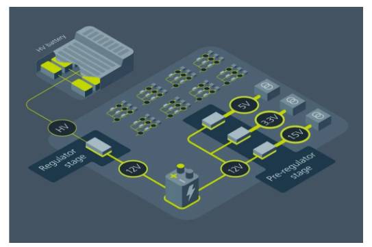 維護一款 12V 的物理電池,就意味著維護一個具有不必要冗余的低效率 PDN。在典型的汽車 12V PDN 中,所有連接 12V 母線的 12V 負載都有內部前置穩(wěn)壓器,可將寬輸入電壓范圍(通常從 6V 到 16V)轉換為 5V、3.3V 或更低電壓。從全球系統(tǒng)角度來看,無論是電動汽車、混合動力汽車,還是插電式混合動力汽車,都有串聯(lián)穩(wěn)壓器冗余。一款從高壓到 12V 的 DC-DC 轉換器可為 12V 母線(效率高)穩(wěn)壓,而前置穩(wěn)壓器則可為每個負載提供合適的內部電壓(圖 1)。