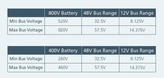 表 1:采用 Vicor BCM/NBM 母線轉換器技術的 48V 母線和 12V 母線上的最小電壓和最大電壓。48V 和 12V 電壓范圍均符合 VDA 320 和 LV 124 標準。