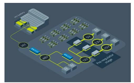 圖 2:優(yōu)化的 E/E 架構可取消 12V 的物理電池。使用 Vicor BCM 母線轉換器技術轉化高壓電池,可創(chuàng)建虛擬 12V 電池。