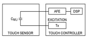 為了最大化SNR并支持兩個(gè)或多個(gè)明確的觸摸,很明顯,最理想的觸摸系統(tǒng)架構(gòu)依賴(lài)于互電容。圖1中的系統(tǒng)框圖說(shuō)明了通用互電容實(shí)現(xiàn),該實(shí)現(xiàn)將激勵(lì)信號(hào)施加到觸摸傳感器電容器板之一。另一個(gè)觸摸傳感器電容器極板連接到觸摸控制器的模擬前端(AFE)。AFE輸出將轉(zhuǎn)換為數(shù)字形式,并在數(shù)字信號(hào)處理器(DSP)中進(jìn)行進(jìn)一步處理。