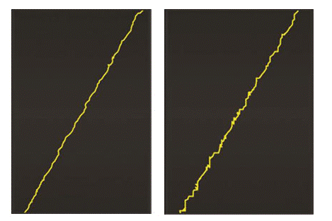 由機(jī)器人手臂握住4mm金屬?gòu)楊^繪制的線(xiàn)圖。左側(cè)的圖反映了高SNR觸摸控制器的使用;右邊是一個(gè)低信噪比的觸摸控制器。